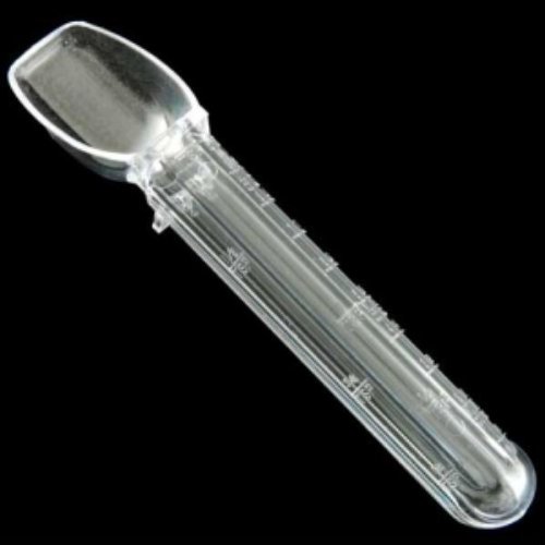 This clear plastic medicine spoon comes with measurements in increments of 1/2 teaspoon up to 2 teaspoons and increments of single mL up to 10mL.